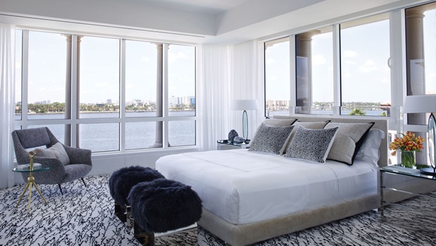 With a view like the one from this bedroom, you don’t need to work too much on the room decoration. The neutral tones, especially the grey shades, are the perfect color schemes for a bedroom design with a luxury interior design and a view to the city outside!