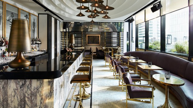 Use black and gold design pieces is a way to get a curated and exquisite room decoration. On a bar design, like the one from this luxury restaurant, the modern bar stools gain a plush of glamour and exuberance with the black leather and the metallic gold finishing.